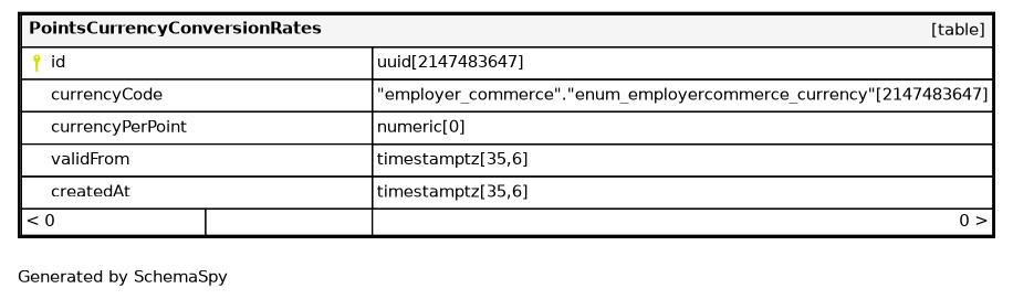 | PointsCurrencyConversionRates_currencyCode_validFrom_key | Must be unique | Asc/Asc | currencyCode + validFrom |