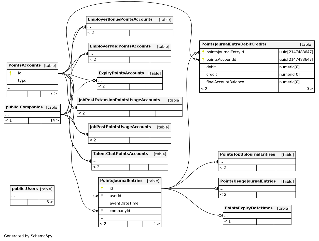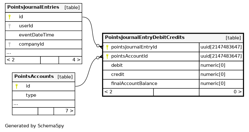 | PointsTopUpJournalEntryDebitCredits_pkey | Primary key | Asc/Asc | pointsJournalEntryId + pointsAccountId |