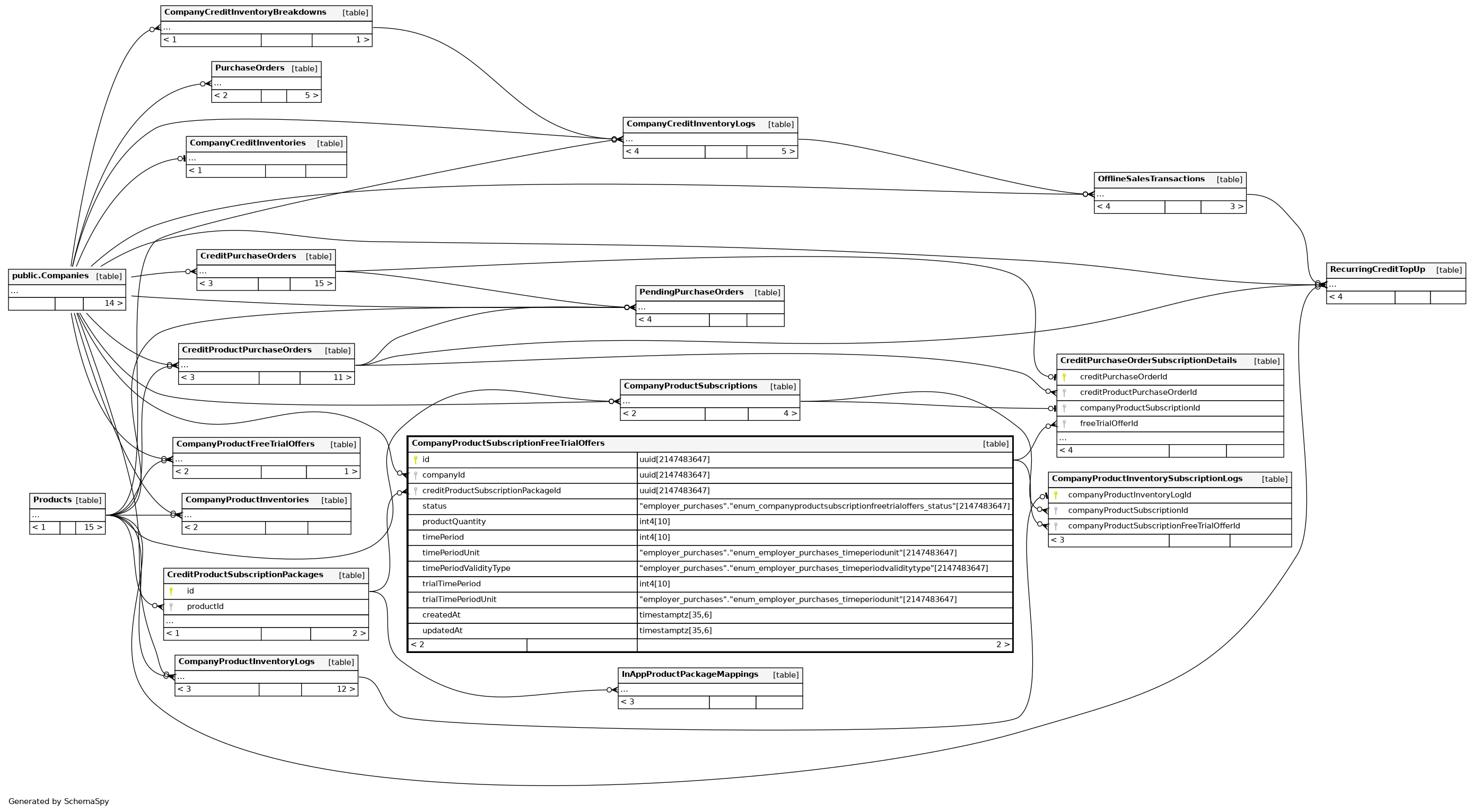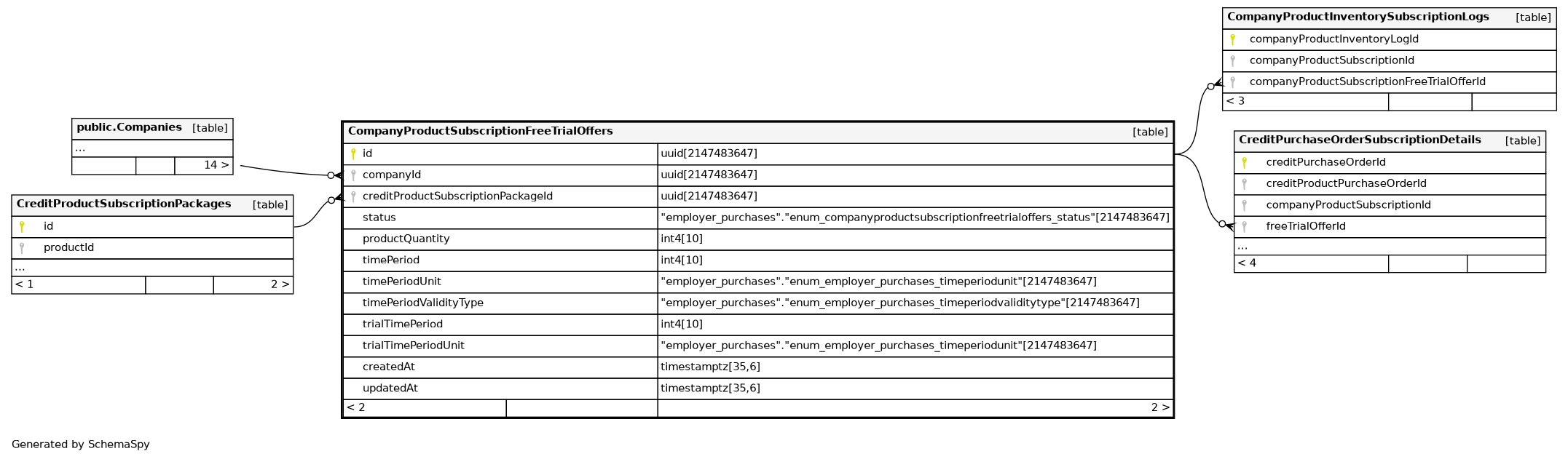 | CompanyProductSubscriptionFreeTrialOffers_unique_idx | Must be unique | Asc/Asc/Asc | companyId + creditProductSubscriptionPackageId + status |