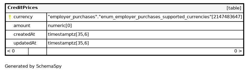 | CreditPrices_pkey | Primary key | Asc | currency |