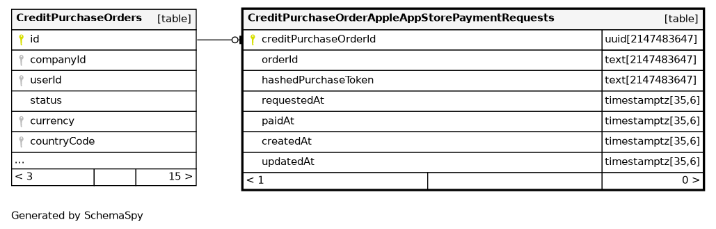 | CreditPurchaseOrderAppleAppStorePaymentRequests_pkey | Primary key | Asc | creditPurchaseOrderId |