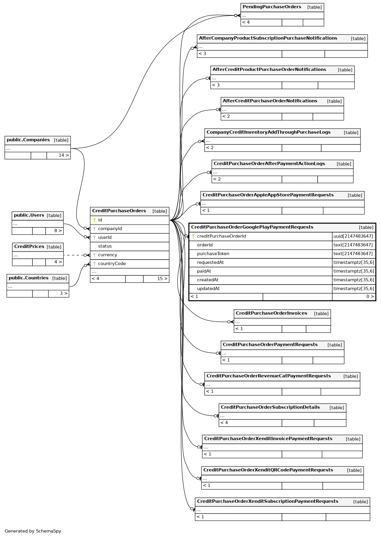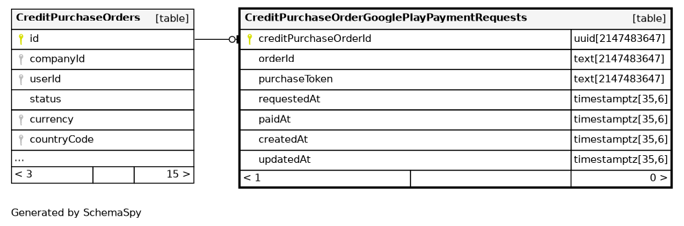 | CreditPurchaseOrderGooglePlayPaymentRequests_pkey | Primary key | Asc | creditPurchaseOrderId |