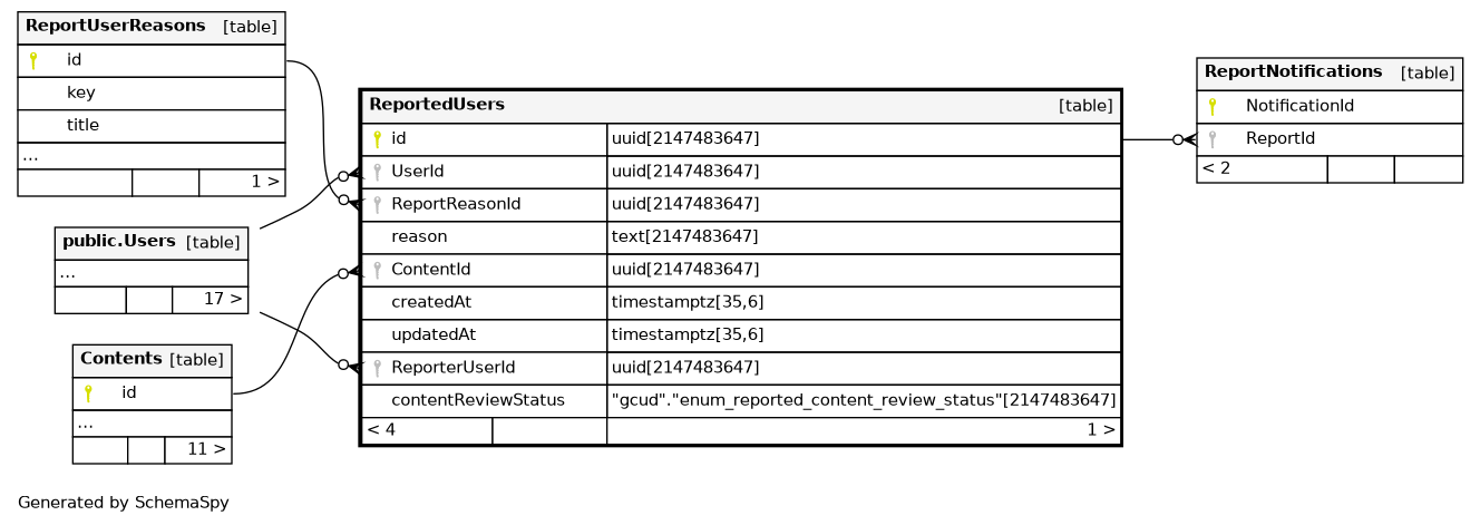 | ReportedUsers_ContentId_UserId_ReporterUserId_key | Must be unique | Asc/Asc/Asc | ContentId + UserId + ReporterUserId |