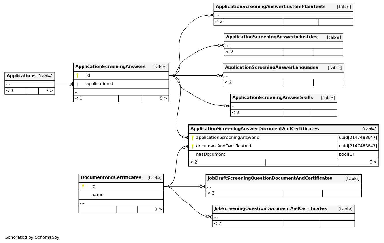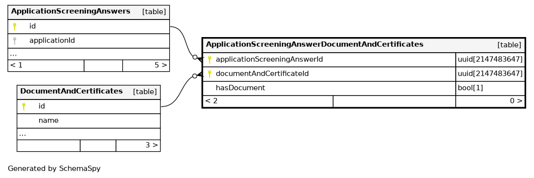 | ApplicationScreeningAnswerDocumentAndCertificates_pkey | Primary key | Asc/Asc | applicationScreeningAnswerId + documentAndCertificateId |