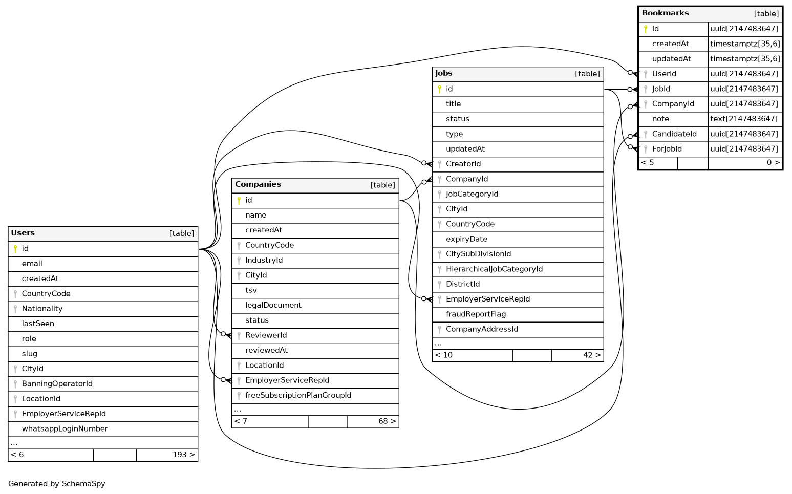 | Bookmarks_UserId_CandidateId_ForJobId_key | Must be unique | Asc/Asc/Asc | UserId + CandidateId + ForJobId |