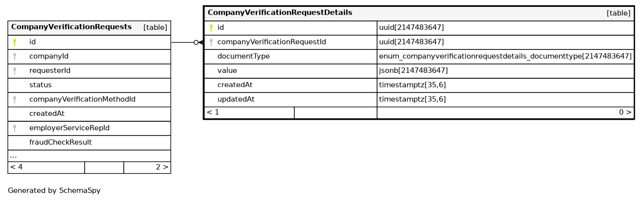 | CompanyVerificationRequestDetails_unique_idx | Must be unique | Asc/Asc | companyVerificationRequestId + documentType |