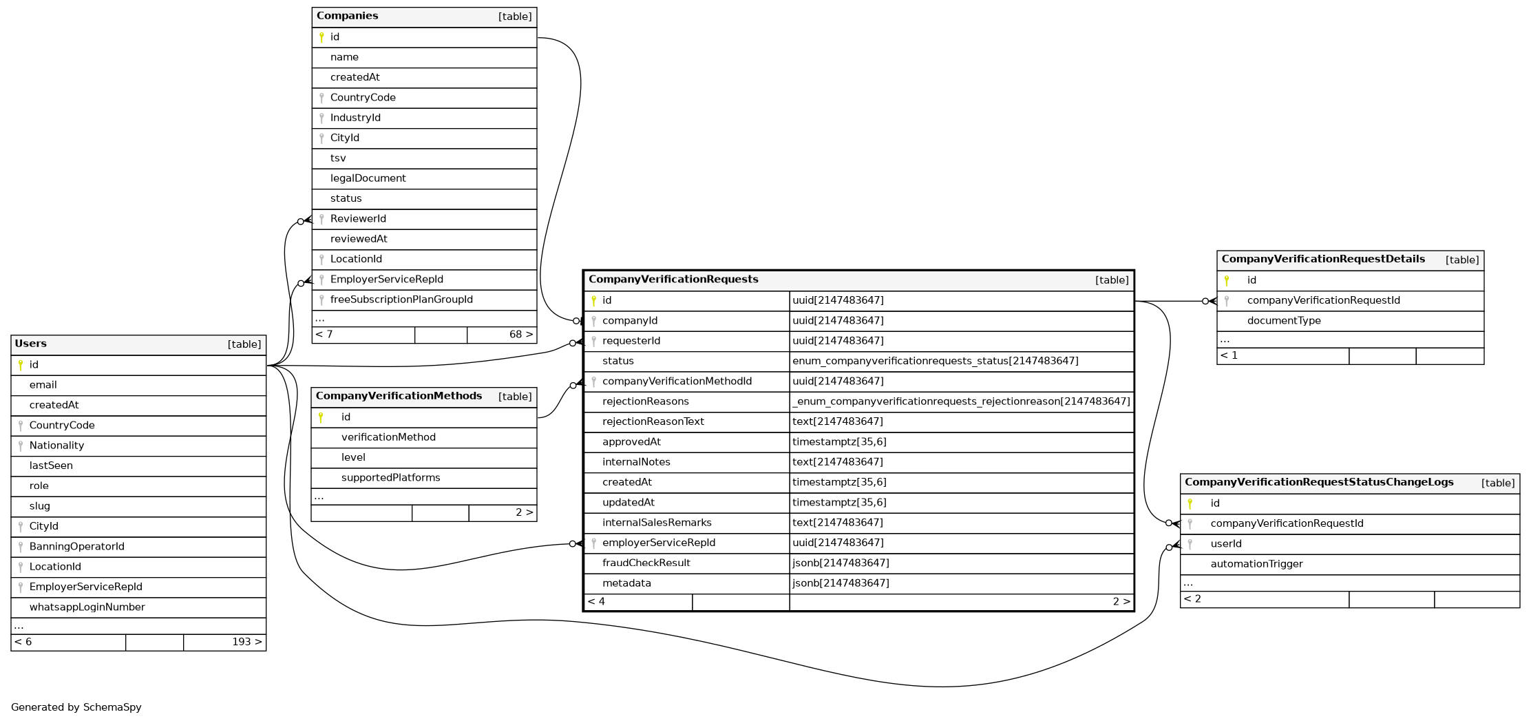 | CompanyVerificationRequests_approved_unique_idx | Must be unique | Asc/Asc/Asc | companyId + status + companyVerificationMethodId |