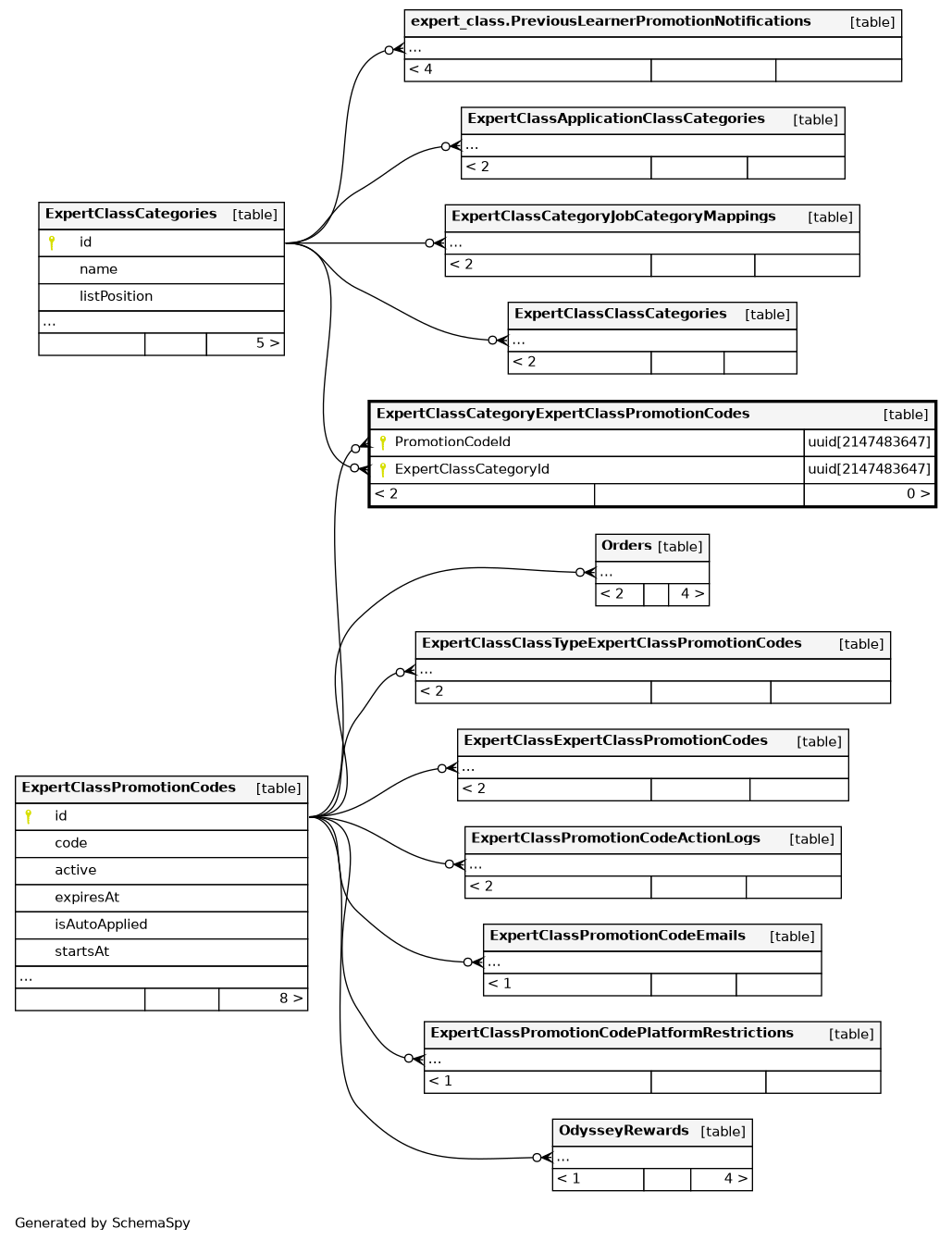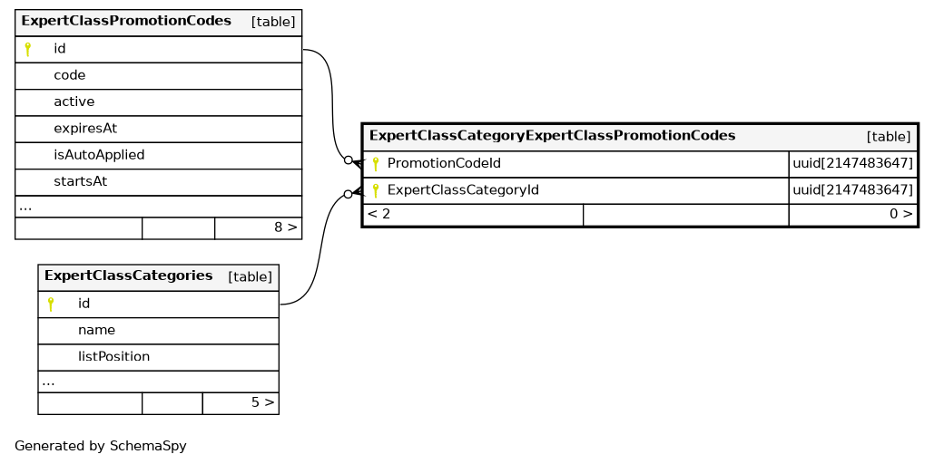 | ExpertClassCategoryExpertClassPromotionCodes_pkey | Primary key | Asc/Asc | PromotionCodeId + ExpertClassCategoryId |