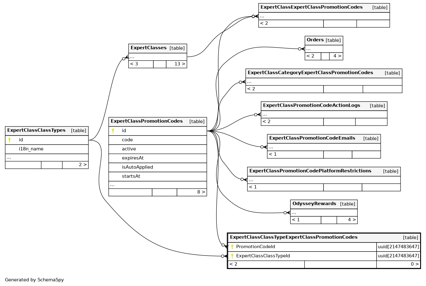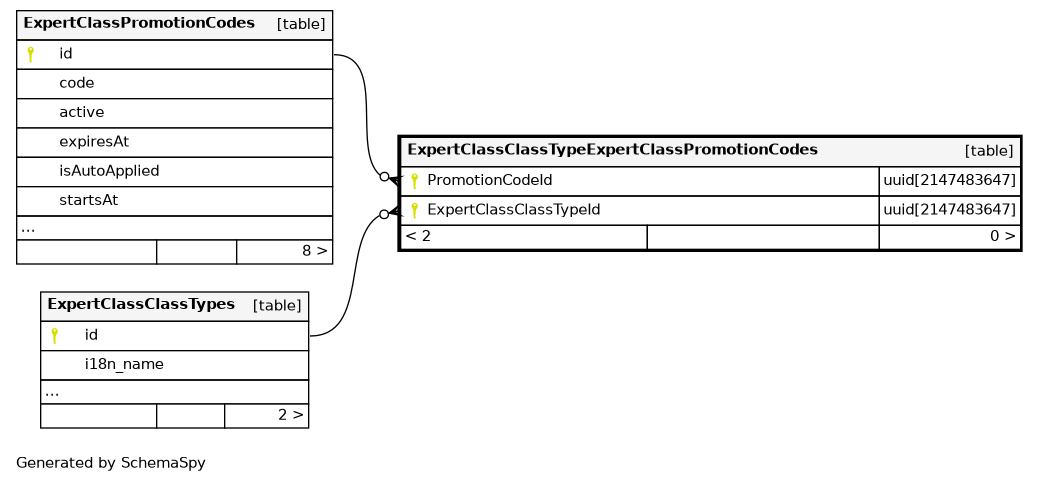 | ExpertClassClassTypeExpertClassPromotionCodes_pkey | Primary key | Asc/Asc | PromotionCodeId + ExpertClassClassTypeId |