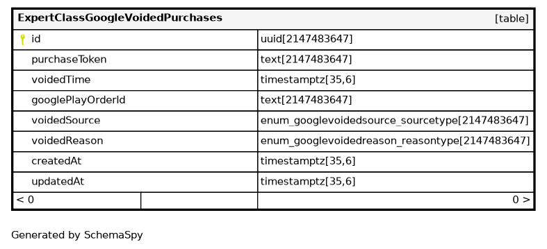 | ExpertClassGoogleVoidedPurchases_purchaseToken_key | Must be unique | Asc | purchaseToken |