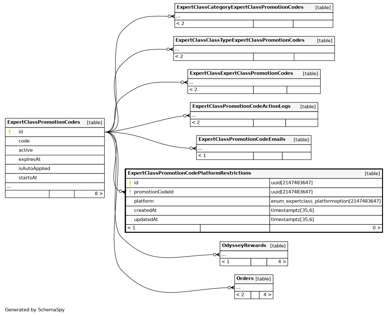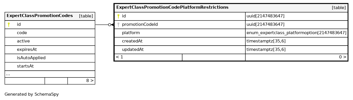 | ExpertClassPromotionCodePlatformRestrictions_promotionCodeId_pl | Must be unique | Asc/Asc | promotionCodeId + platform |