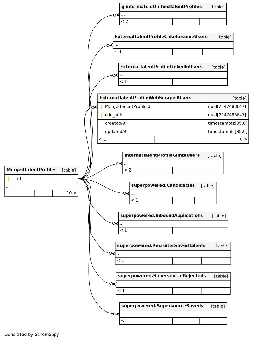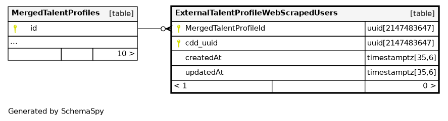 | ExternalTalentProfileWebScrapedUsers_MergedTalentProfileId_cdd_ | Primary key | Asc/Asc | MergedTalentProfileId + cdd_uuid |