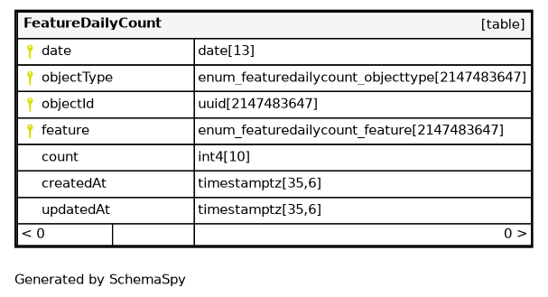 | FeatureDailyCount_pkey | Primary key | Asc/Asc/Asc/Asc | date + objectType + objectId + feature |