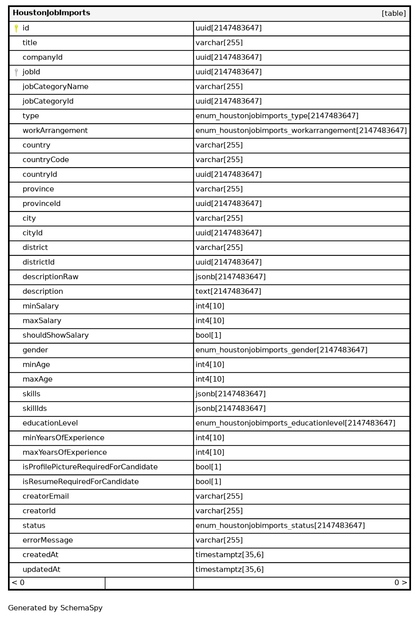 | HoustonJobImports_pkey | Primary key | Asc | id |