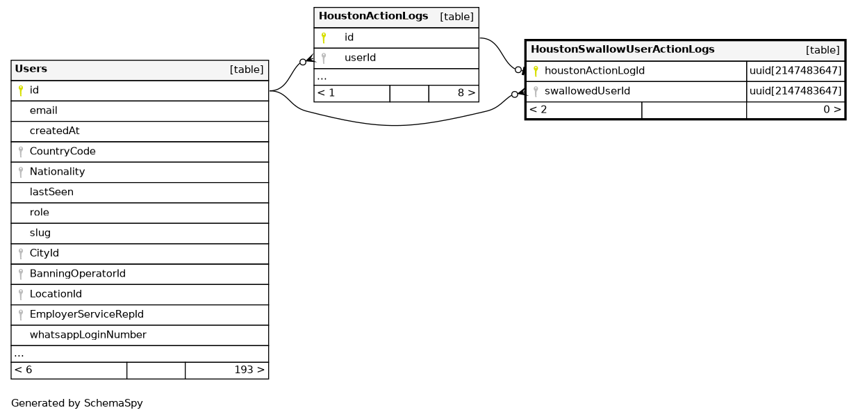 | HoustonSwallowUserActionLogs_pkey | Primary key | Asc | houstonActionLogId |