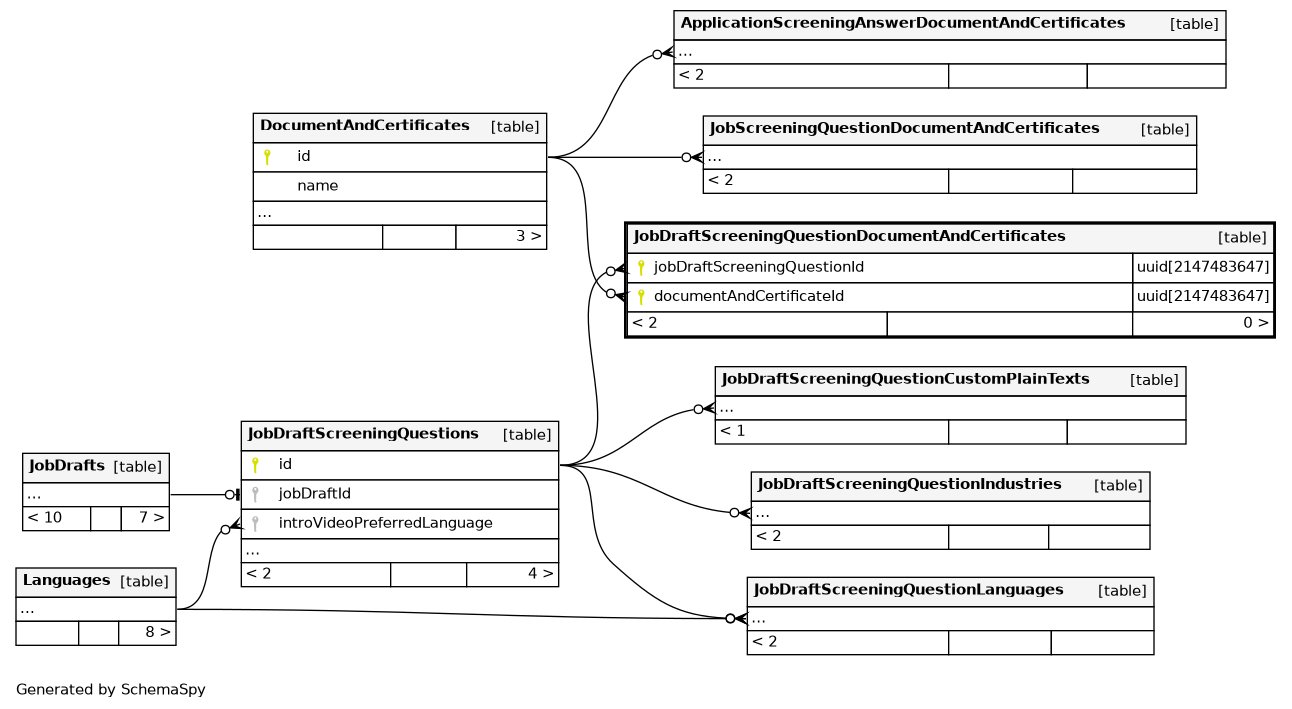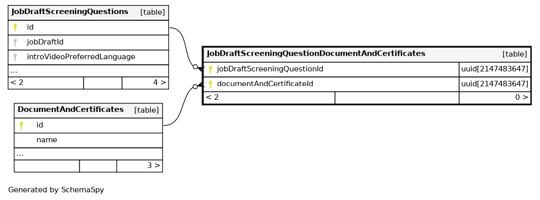 | JobDraftScreeningQuestionDocumentAndCertificates_pkey | Primary key | Asc/Asc | jobDraftScreeningQuestionId + documentAndCertificateId |