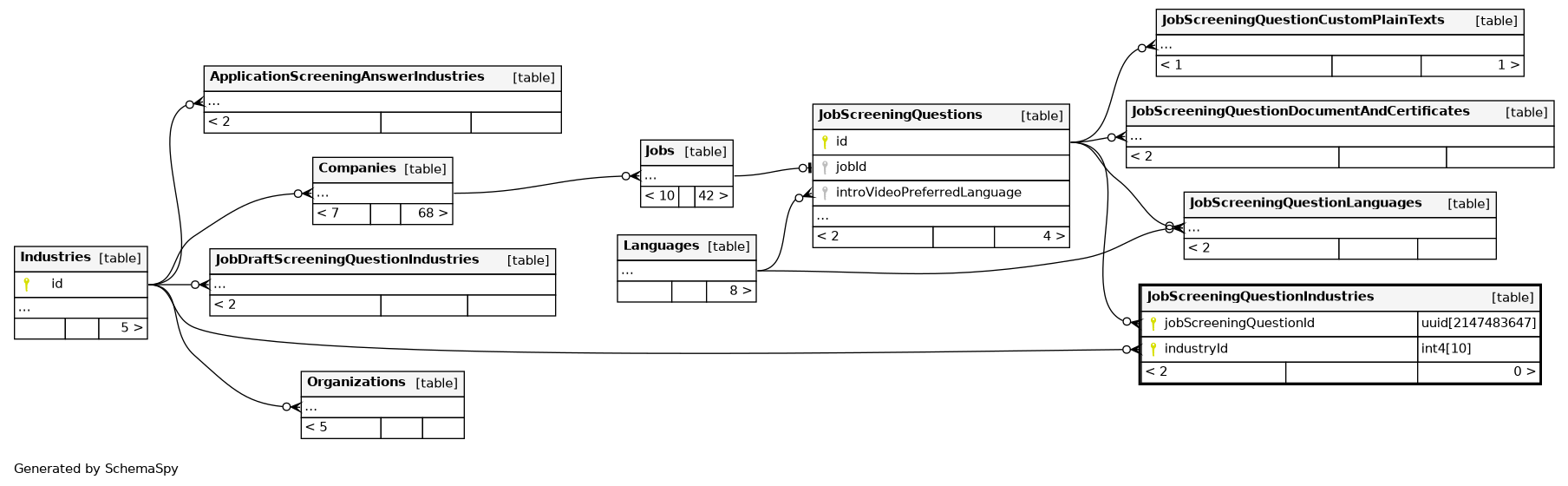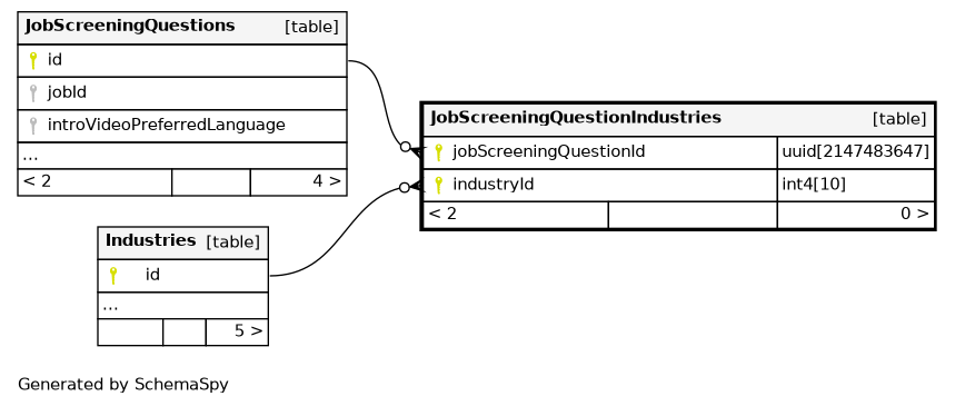 | JobScreeningQuestionIndustries_pkey | Primary key | Asc/Asc | jobScreeningQuestionId + industryId |