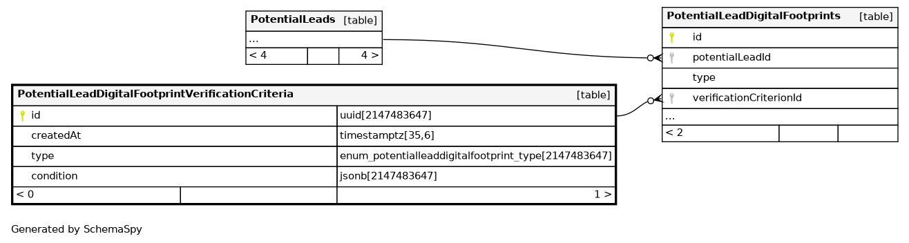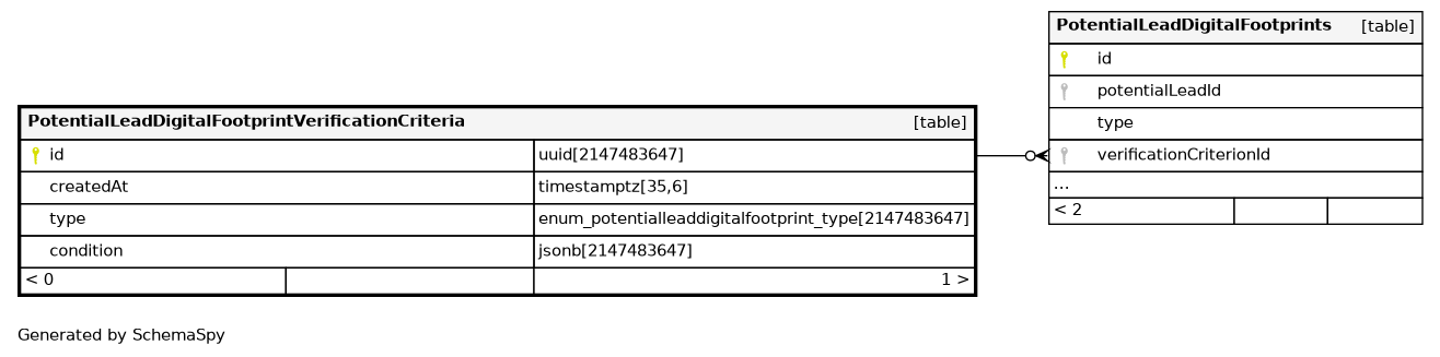 | PotentialLeadDigitalFootprintVerificationCriteria_pkey | Primary key | Asc | id |
