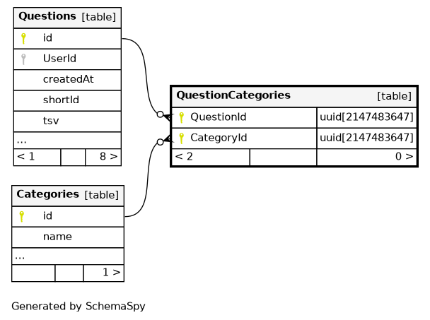 | QuestionCategories_pkey | Primary key | Asc/Asc | QuestionId + CategoryId |