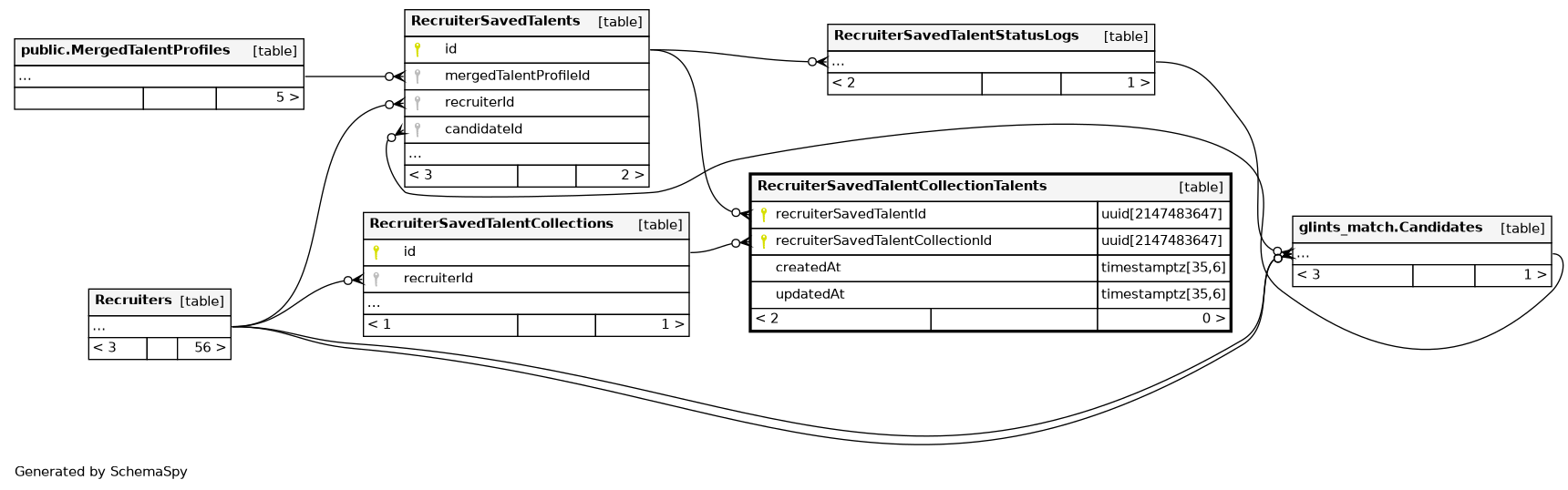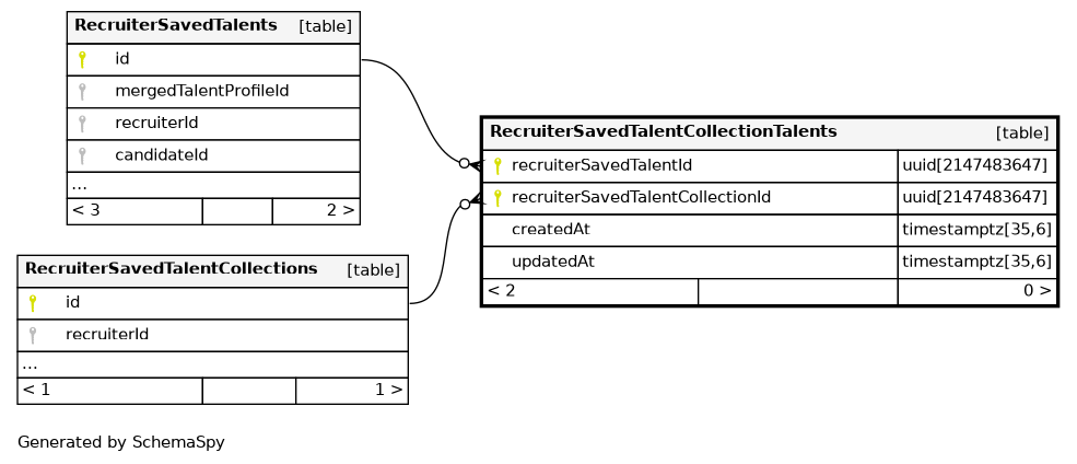 | RecruiterSavedTalentCollectionTalents_pkey | Primary key | Asc/Asc | recruiterSavedTalentId + recruiterSavedTalentCollectionId |