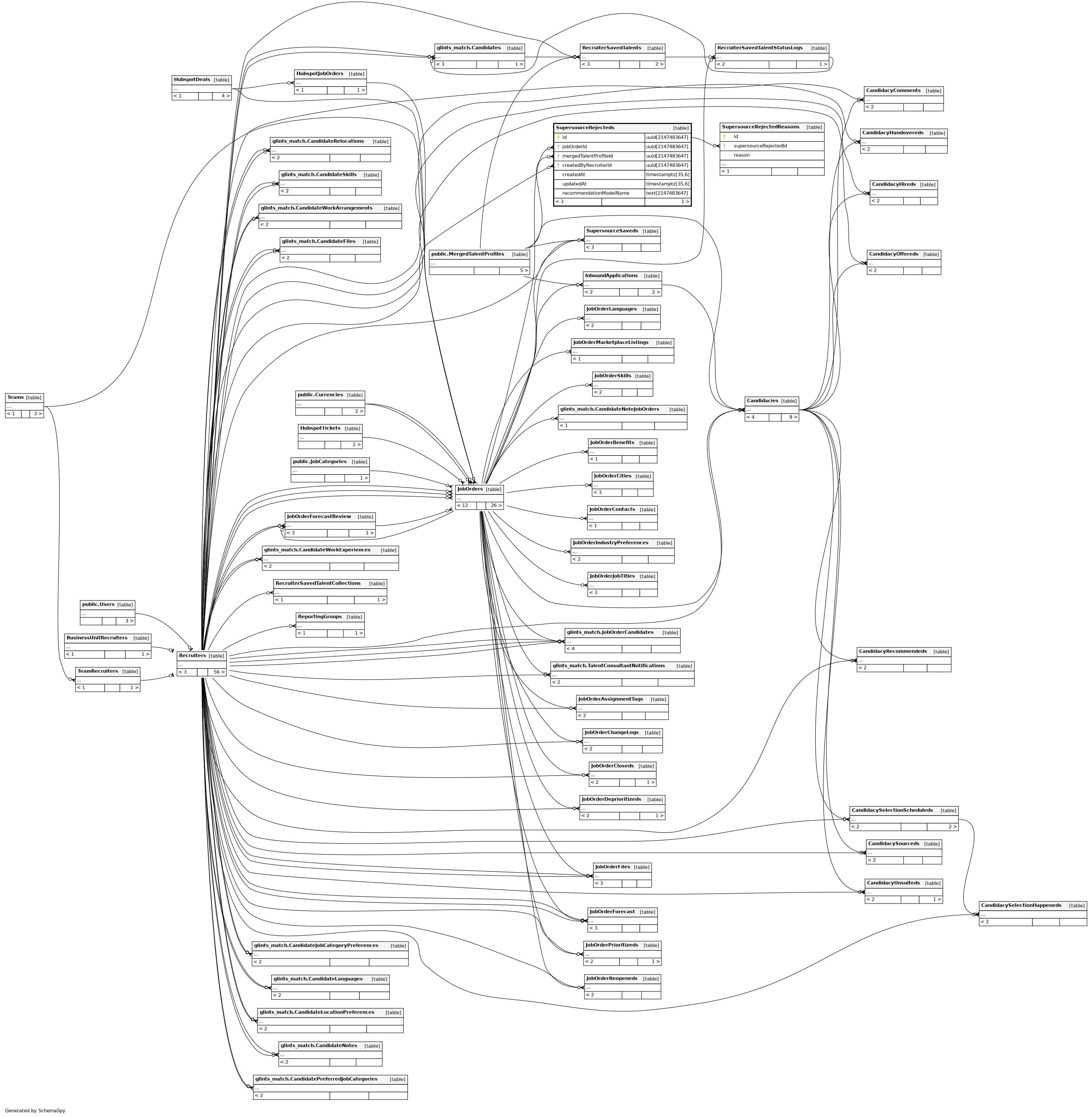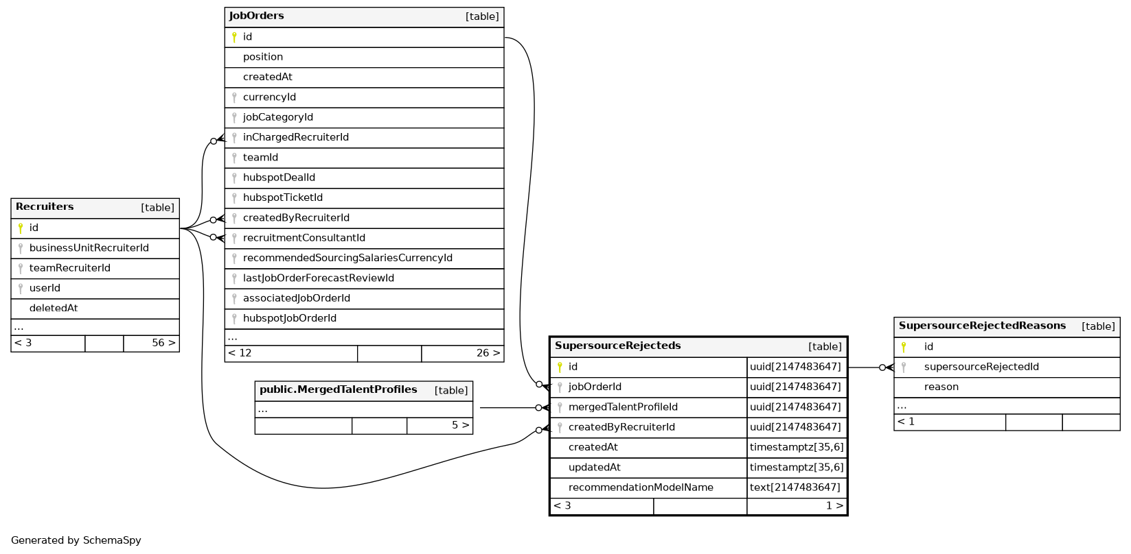 | SupersourceRejecteds_mergedTalentProfileId_jobOrderId_key | Must be unique | Asc/Asc | mergedTalentProfileId + jobOrderId |